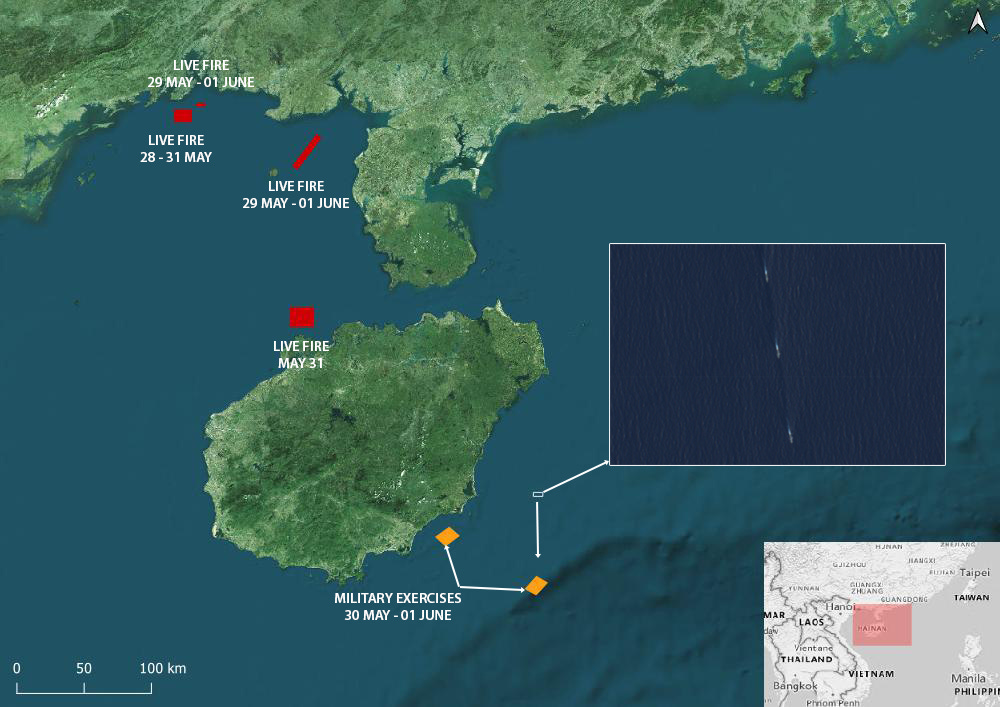 Ngoài ra, một cuộc tập trận cũng được tổ chức ở hai khu vực đông nam đảo Hải Nam từ 30.5 đến 1.6. Hình ảnh vệ tinh ngày 29.5 cho thấy một nhóm 3 tàu chiến Trung Quốc di chuyển theo đội hình đến một khu vực tập trận.